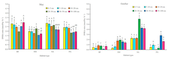 In the month of May, DNRA rates were not affected by soil depth or habitat type (Figure 2). No significant differences were found in the DNRA rates between habitat types in either upper soil layers or in the deeper soil layers. The DNRA rates in S. alterniflora marshland were not significantly different from those in the other habitat types in the month of May. In the month of October, the DNRA rates in the S. alterniflora marshland were significantly higher than those in other habitat types in all soil layers. DNRA in the deeper soil layers (50–100 cm) in the month of October were markedly higher than those in the 0–5 cm and 5–10 cm the upper soil layers. The two-month-averaged DNRA in the S. alterniflora stands was significantly higher than that of other habitat types (Figure 3).