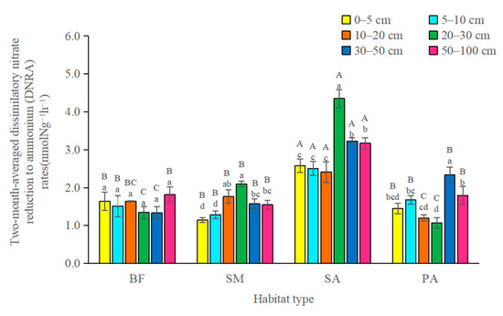 Potential rates of dissimilatory nitrate reduction to ammonium (DNRA). Bars represent standard errors of the quadruplicate samples. SM: S. mariqueter; SA: S. alterniflora; PA: P. australis; BF: bare mudflat. Bars with different uppercase letters and lowercase letters denote significantly different in habitat types and soil depths, respectively (p < 0.05).