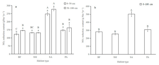 NO3− retention content between four habitat types: (a) in the upper 50 cm and deeper 50 cm, (b) at the 0–100 cm depth. Error bars in the column represent standard errors. SM: S. mariqueter; SA: S. alterniflora; PA: P. australis; BF: bare mudflat. Bars with different uppercase letters and lowercase letters denote significantly different in habitat types and soil depths, respectively (p < 0.05).