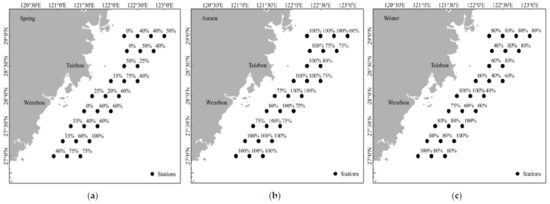 Zero value ratio of E. japonicus in offshore waters of southern Zhejiang in spring, autumn, and winter from 2015 to 2021: (a) Spring; (b) Autumn; and (c) Winter.