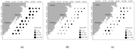 Distribution of E. japonicus in offshore waters of southern Zhejiang in spring, autumn, and winter from 2015 to 2021: (a) Spring; (b) Autumn; and (c) Winter.