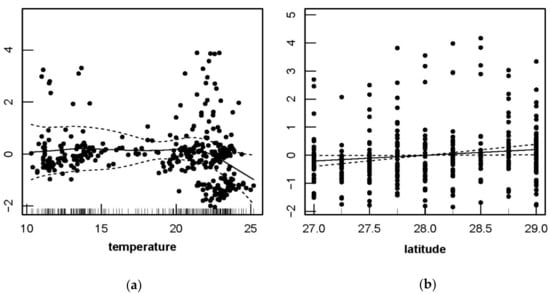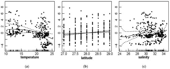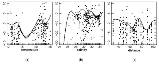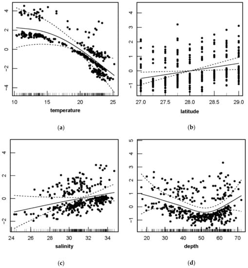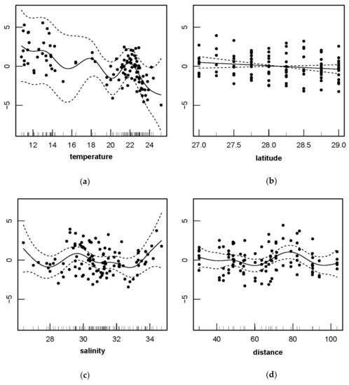 GAMM is an extension of GAM, including fixed and random effects, which is very suitable for processing time series and autocorrelation data [31]. In the southern sea area of Zhejiang, the distribution of E. japonicus changes with season [27]. In this study, season (month) was used as a random error term of GAMM. GAMM expression is as follows: