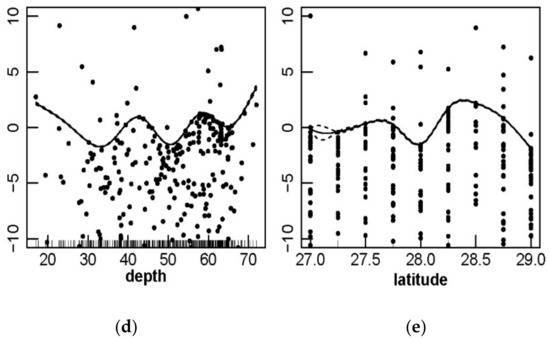 Latitude, as a spatial factor, plays an important role in the resource density of E. japonicus in the offshore waters of southern Zhejiang. It has an indirect effect on the distribution of E. japonicus, by changing other environmental factors, such as temperature and salinity [47]. In this study, GAM1 (Figure 4b) showed a positive linear correlation, while GAM2 showed a negative linear relationship (Figure 5b). Every spring, with the gradual increase in water temperature, the wintering stock located at lower latitudes gradually leaves the wintering grounds for waters at higher latitudes for breeding migration under the effect of gonad maturation. In autumn, influenced by the decreasing water temperature, E. japonicus began to migrate to the southern waters with higher water temperature [45], which migrates between high and low latitudes. Latitude represents water temperature to a certain extent. Thus, it can affect the resource density of E. japonicus stock.