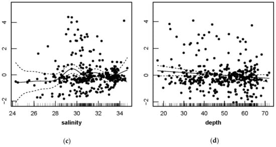 Response curves for variables of GAM 1 in two-stage GAM: (a) effect of temperature; (b) effect of latitude; (c) effect of salinity; and (d) effect of depth. Dashed lines show 95% confidence intervals. The dots represent the residuals.