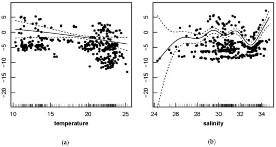 Response curves for variables of Tweedie-GAM: (a) effect of temperature; and (b) effect of salinity. Dashed lines show 95% confidence intervals. The dots represent the residuals.