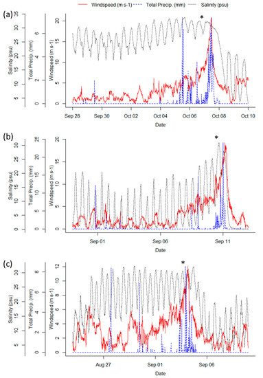 - Mallin, M.A.; Corbett, C.A. How Hurricane Attributes Determine the Extent of Environmental Effects: Multiple Hurricanes and Different Coastal Systems. Estuaries Coasts 2006, 29, 1046–1061. [Google Scholar] [CrossRef]