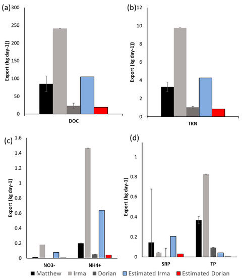 - Chen, S.; Lu, Y.; Dash, P.; Das, P.; Li, J.; Capps, K.; Majidzadeh, H.; Elliott, M. Hurricane Pulses: Small Watershed Exports of Dissolved Nutrients and Organic Matter during Large Storms in the Southeastern USA. Sci. Total Environ. 2019, 689, 232–244. [Google Scholar] [CrossRef] [PubMed]