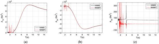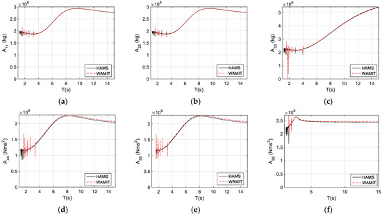 The conventional added mass of the TALOS wave-energy converter is presented in Figure 2, including the added mass for surge (), sway (), heave (), roll (), pitch (), and yaw (). We can observe from the comparisons between HAMS and WAMIT that they are almost identical, and some differences (spikes) can be observed in the so-called irregular frequencies in the short waves, when the wave period, , is less than 3 s. The reason for the irregular frequencies may relate to the panel size: as a rule of thumb, the maximal panel size should be less than 1/8 of the wave length (see [37]).