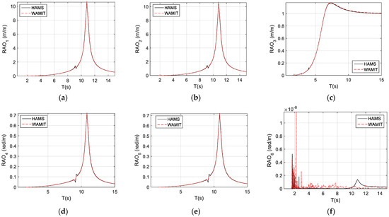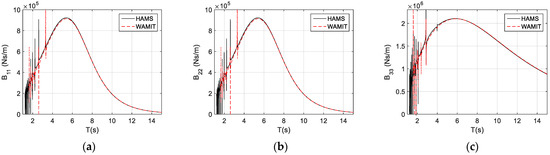The conventional radiation-damping coefficients of the TALOS wave-energy converter are presented in Figure 4. These include the radiation-damping coefficients, for surge, for sway, for heave, for roll, for pitch, and for yaw. Again, we can observe that the results from HAMS and WAMIT are almost identical, with differences at the irregular frequencies in the short waves (the wave periods, , less than 4 s). Again, these irregular frequencies are due to the limited panel size, similar to the cases in the added mass.
