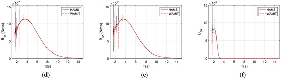 Similarly, we can observe that there are some strong couplings between the motions, such as surge pitch (see , Figure 5a) and sway roll (see , Figure 5b), and these coupling terms would correspond to those of the strong coupling terms on added mass. These strongly coupled radiation-damping coefficients would have similar orders of magnitude as those conventional radiation-damping coefficients (refer to Figure 4a,b). One interesting factor is that the coupled radiation-damping coefficient can be negative, for instance, the coupled radiation-damping coefficients for sway and roll, (Figure 5b), which is very different from the positive conventional radiation-damping coefficient. This can be understood as follows: in the conventional radiation-damping coefficients, the self-radiation would simply radiate the wave away due to the structure motion, and dissipate the energy from the moving structure, hence the radiation-damping coefficient must be positive; while in the coupled damping coefficients, for instance, , which is the damping coefficient due to the radiated wave from the roll motion (the subscript ‘4’) contributing to the damping effect on the sway motion (the subscript ‘2’), the coupling effect is in an opposite phase, hence it is physically negative (for a comparison, is positive, see Figure 5a).