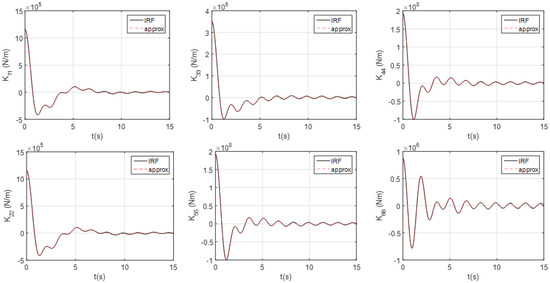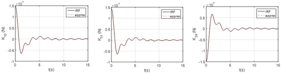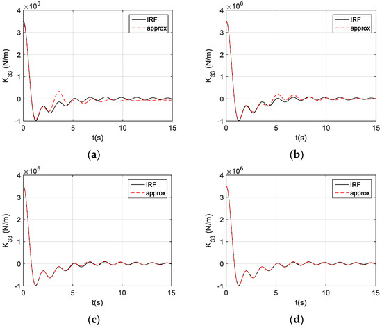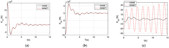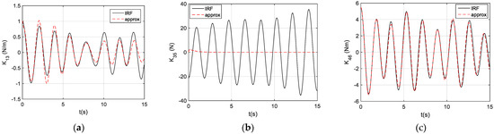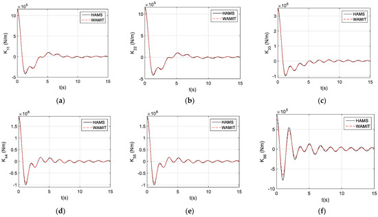 When we examined the dynamically coupling terms between the different motion modes, we observed the coupling terms between the surge pitch, , and sway roll, (see Figure 9a,b). These were strong coupling terms, since their magnitudes would be in orders similar to those of the conventional impulse functions. In comparison, the impulse functions for the strong coupling terms from HAMS and WAMIT were almost identical.
