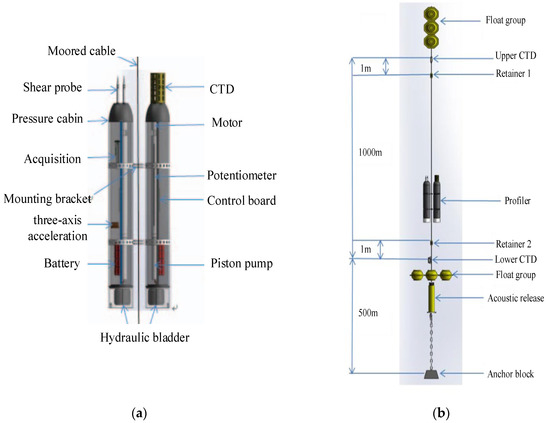 The main structure and whole observation platform of the ARTP is shown in Figure 1. The whole turbulence observation platform includes the following five parts (shown in Figure 1b). Except the core part of the ARTP, the float groups were designed to provide buoyancy and ensure the stability of the whole system. Two groups of CTD sensors are used to collect the environment parameters in different positions. The two retainers are tied one meter away from the CTD sensors and strong enough to support the full weight of ARTP, even through the inertial force by the high speed movement. The two retainers can stop the motion of ARTP to control it, reciprocating up and down between them. Under the combined effect of the float groups and the anchor block, the whole system underwater can keep a vertical state. When the observation finished, the acoustic release receives the control signal and releases the anchor block, then the whole observation platform ascends to the sea surface under the effect of buoyancy.