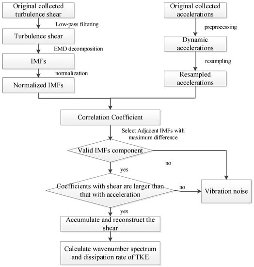 The flow chart of the new method to calculate the dissipation rate of TKE is given in Figure 3. The correlation coefficient between each IMF component and accelerations are calculated to remove the vibration noise coherent with the accelerometers data. In addition, to ensure the IMFs are effective, the correlation coefficients between the sensitive IMFs and raw shear are also calculated. From the view of signal orthogonal correlation, we select the valid IMFs that are highly orthogonal to raw shear and lowly orthogonal to accelerations as the vibration noise. Based on the reconstructed signal, calculate the wavenumber spectrum and compare it with the standard Nasmyth theoretical spectrum to evaluate the denoising effect of the new method.