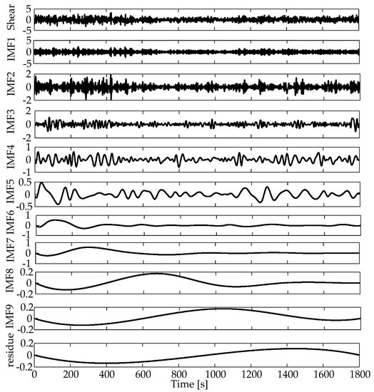 In Figure 7, each IMF modes has its own time scales and frequencies. IMF1–IMF9 represent the different parts of the original ocean turbulence shear signal with the frequency from high to low. The time scales of the nine IMF modes become larger as the orders increase, while the frequency and amplitudes become smaller. The variation tendency of IMF1 is the most similar to the original shear signal and the residue only represents the general trend. The correlation coefficients of IMF components and raw shear, as well as accelerations, are shown in Figure 8.