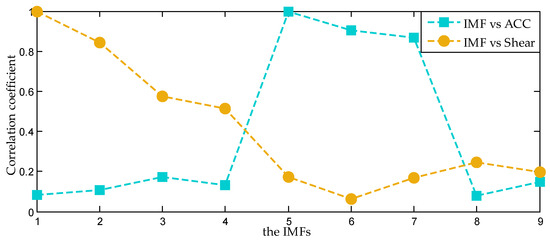 - Calculate and normalize the correlation coefficient between the obtained IMFs and the raw shear as well as the accelerations. Select the two adjacent coefficients with the acceleration signal that has the maximum difference. Compare the correlation coefficients of these IMF to ensure the coefficients with the raw shear is larger than that with the accelerations signal and obtain the valid IMFs.