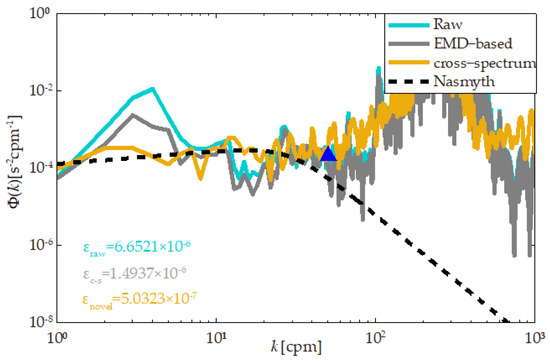 Finally, calculate the turbulence shear spectrum based on the reconstructed shear signal and transform it into a wavenumber domain under Taylor’s frozen turbulence hypothesis [27]. Typically, the Nasmyth theoretical spectrum is used as the standard spectrum to evaluate the denoising effectiveness [28]. Here, the effectiveness of the EMD-based denoising method is compared with the traditional cross-spectrum denoising method and both of the two denoised spectra are compared with the Nasmyth theoretical spectrum, which are shown in Figure 10. In Figure 10, the three solid curves are the observed spectra, respectively, where the green curve is the raw shear spectrum, the golden one is the spectrum after being corrected with the denoising method proposed in this paper, and the brown one shows the spectrum after being processed with the traditional cross-spectrum denoising method. The black dashed curve is the Nasmyth theoretical spectrum, and the blue solid triangle represents the cut-off wavenumber.