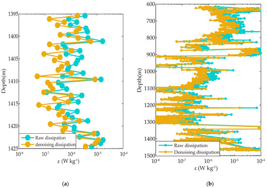 The results show that the novel EMD-based denoising method can effectively take advantage of the correlation coefficient between each IMF component and the accelerations, as well as the raw shear, to eliminate the invalid IMFs, which effectively suppress the low frequency vibration component in the original signal. The novel EMD-based denoising method is also applied to one whole profile collected using the ARTP, and the calculated dissipation rate of TKE from the raw shear and the clean shear are compared in Figure 11. Compared with the dissipation rate of TKE computed with the raw shear, the results obtained from the reconstructed shear drop by different orders of magnitude, which provides a reliable and effective data foundation for the further analysis of the turbulence characteristics and turbulence evolution.