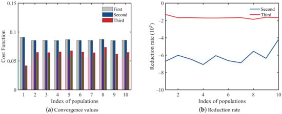 In Figure 5a, initial values of the cost function are about 0.2, and few populations reached 0.25. This value is the global optimal solution searched by the whole population at the beginning. Therefore, it is slightly less than the random choice. After the first optimization, the value of the cost function all drop below 0.1, and , and have been obtained, which leads to the small initial value of the second optimization. The second optimization is essentially the re-optimization of the first optimization. Hence, the value of cost function does not decrease much. In the first and second optimization, because the particle dimension is less. The curve converges quickly. The curves of 10 populations converge within 100 generations. However, in the third optimization, the curve does not converge until the 200th generation. In the third optimization, the convergence value of one population reached 0.04, which is significantly different from the other nine populations. The difference is caused by the slight difference in the previous two optimizations. The three-level optimization process of the population finding out the optimal solution is shown in Figure 5d. The blue, red and yellow lines represent the first, second and third optimization process respectively. In the first two optimizations, the optimal solution is used as the initial condition for the next optimization.