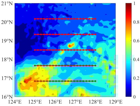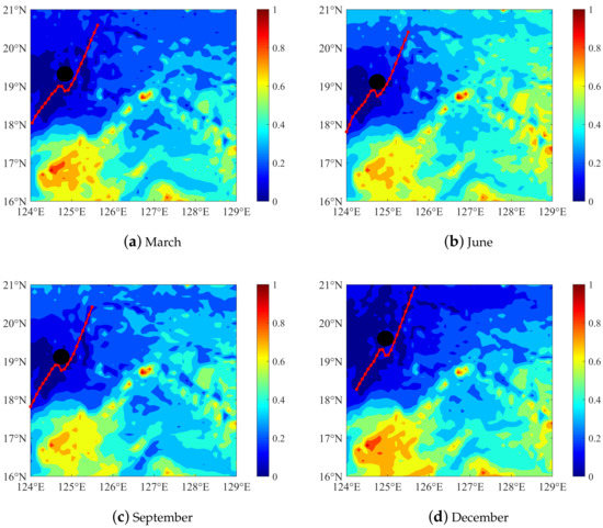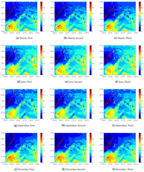 The color bar represents the value of the background field, and the red line on background is the observation scheme based on a single platform. Each column represents an optimization level, and each row represents a month in Figure 8. The sampling points calculated through the third-level optimization are roughly distributed around the linear scheme. The range of observation is concentrated in the low value (blue) region, which is consistent with the intuitive experience. The scheme is similar to the usual N-type. The background fields constructed based on forecast in four months are similar, which lead the schemes to also be similar across the four months.