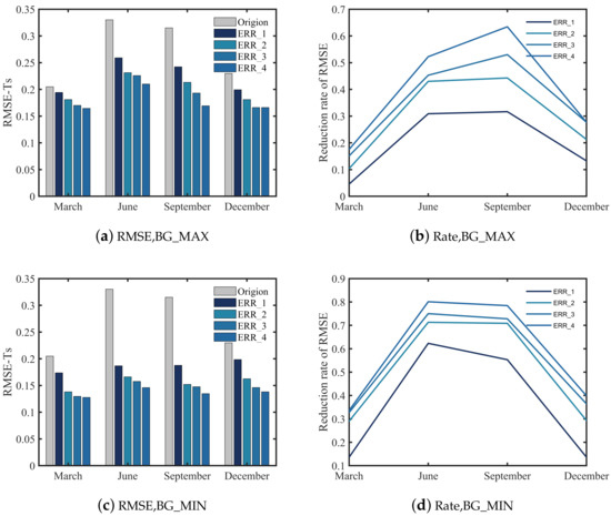 The panels (a, b, c, d) in Figure 2 clearly shows that the RMSE introduced samples in BG_MIN is less than BG_MAX in most time. Exceptions also occur when the forecast error is small enough. The reductions in RMSE with samples in BG_MIN in four months are 34.8%, 77.3%, 77.2%, and 43.1%, respectively. Compared to the reductions with samples in BG_MAX (19.5%, 52.9%, 63.0%, 27.4%), the improvement is evident. However, in practical application, the observation error is not going to be ideal. In order to be closer to the actual situation, the experiment is repeated with the observation error (obs_err = ), and the error is greater than the mean of forecast error. The result is shown in Figure 3.