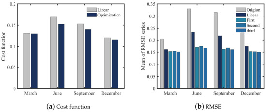 From Figure 13a, for the value of the cost function, the observation scheme optimized is reduced 1.0%, 9.8%, 8.3%, and 3.7% in March, June, September, and December, respectively. The gap with the experimental group is small because the observation positions of the control group are almost all located in the small value region of the background field (blue area). From Figure 13b, in the sampling simulation experiment based on the twin frame, the sampling results after each optimization are all better than the control group. The means of the RMSE series obtained according to the optimized scheme are 0.15, 0.17, 0.16, and 0.15 in March, June, September, and December, respectively. Compared to the control group, these are reduced by 6.1%, 28.3%, 26.3%, and 14.6%, respectively. Compared to the forecast, these are reduced by 26.3%, 49.3%, 49.1%, and 34.8%, respectively. The difference in the three optimizations is less than 0.01. This phenomenon shows that the optimal observation position has the characteristics of regionalization and that the sampling effect is more dependent on the selection of protection position and recovery position of the platform. In sensitive areas, it is difficult for local adjustment of the observation points to achieve the purpose of improving the sampling effect.