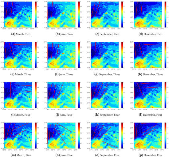 Simultaneous sampling scheme based on 2, 3, 4, and 5 platforms in high freedom degree are shown in Figure 14. The subgraphs in the same column correspond to the same month. And the subgraphs in the same row correspond to the same number of observation platforms. From Figure 15, no matter the platform’s number and month, all platforms are concentrated in the low value region (blue or light blue areas) of the background field. A distance between the sampling paths makes the sampling range enlarged. That is what a constraint on an anchor point does.
