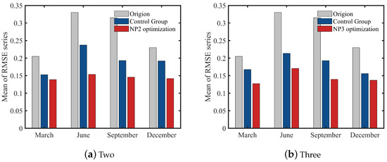 According to the scheme above, the sampling process is simulated in a twin framework. The means of the RMSE series of analysis are compared to the control group in Figure 15. Figure 15a–d describe the improvement of the forecast by sampling based on two platforms, three platforms, four platforms, and five platforms. Compared to the control groups (blue bar), the optimized scheme (red bar) has a certain improvement in the different months and the different number of platforms. For example, in Figure 15a, the means of the RMSE series of optimized analysis are 0.14, 0.15, 0.15, and 0.14. Compared to the control group, they decrease by about 9.1%, 35.3%, 24.6%, and 26.1% in March, June, September, and December, respectively. Compared to the original forecast, it decreased by about 32.3%, 53.5%, 53.8%, and 38.3%. The same results are found on a different number of platforms. When designing a multi-platform simultaneous observation scheme, the conclusion of a single platform hierarchical optimization is applied. Compared with the control group under the condition of a high degree of freedom, the observation effect of the adaptive observation scheme is improved in different months and different numbers of platforms.
