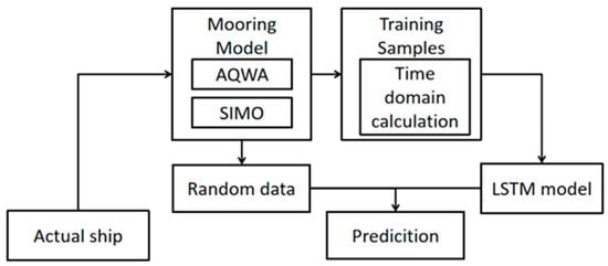 The hydrodynamic and mooring model is established based on the given FPSO. The LSTM model is trained and built according to the AQWA time-domain calculation results to achieve the purpose of calculating the mooring line tension based on the motion of the ship. The specific process is shown in Figure 1. Firstly, establish hydrodynamic and mooring models according to the actual ship. Then carry out the time-domain calculation with corresponding wind, wave, and current environmental conditions to provide samples for training the LSTM network. The next step is to train the data with the LSTM model. Finally, predict the mooring line tension with the random motion, which is not encountered by LSTM neural network model.