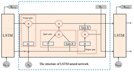 The LSTM neural network is a special recurrent neural network that learns long-term dependent information through repeated structure design. The LSTM neural network not only has the large loop of the external neural network but also the self-loop of the “cell state” of the LSTM itself. The self-loop is controlled by the gate structure processed by three sigmoid activation functions (as shown in Figure 2): The forget gate () determines which part of the memory needs to be forgotten according to the current input, the output at the previous moment, and the offset of the gate; the expression is shown in Equation (1). The input gate () supplements the latest memories; the expressions are shown in Equations (2) and (3). The output gate () determines the output of the moment according to the latest state of the current moment, the output of the previous moment, and the input of the current moment; the expressions are shown in Equations (5) and (6). Equation (4) is the cell state () at time t [11].