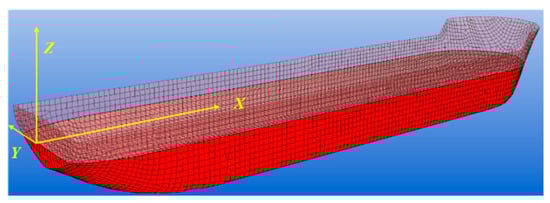 Modeling and meshing are built in AQWA software with the specific form in Figure 3. The FPSO model grid unit is 1 m with the total 10,344 elements. The coordinate origin is located at the water surface, between the stern vertical line length and draft line intersection point. The x-axis is along the length direction of the floating body to the bow, the y-axis is along the width direction of the floating body to the starboard, and the z-axis is vertical upward. In general, the mesh element covers the wet surface, and the size of the mesh element is less than 1/7 of the incident wavelength.