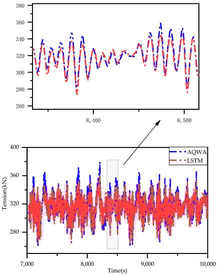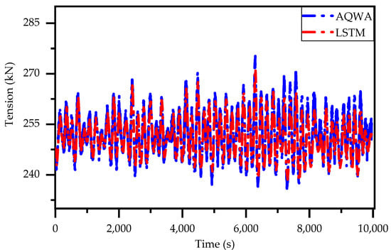 The prediction result of this case is compared with the time-domain calculation result of AQWA to further verify its accuracy. The tension comparison for Mooring Line 2 is shown in Figure 5 for the calculated and the predicted results. Within a wave period, the mooring force predicted by LSTM is in good agreement with that calculated by AQWA, except the amplitude points. The reason why the prediction accuracy of amplitude points is low is that there are less data for amplitude points in the training data, and the change characteristics were not learned by the neural network model completely. The calculation results of the LSTM model and the AQWA results are statistically analyzed in Table 10. The maximum values of the result predicted by LSTM neural network are smaller than those calculated by AQWA, the minimum values of the result predicted by the LSTM neural network are larger than those calculated by AQWA, and the average values are very close. This is because the LSTM neural network has a more accurate prediction value at general points than at amplitude points. In general, the maximum error of LSTM neural network prediction results is 5.25%, which is within the allowable range of engineering. Therefore, it proves that the proposed LSTM neural network model can predict a single short-term working condition.