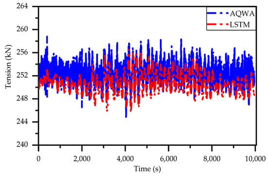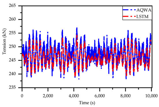 In Figure 6 and Figure 8, we showed a comparison chart of the mooring line tension calculated by LSTM and the results of the AQWA calculation; the blue curve represents the AQWA calculated value, and the red curve represents the LSTM predicted value. The prediction results of the AD10 and AD7 test sets are in good agreement with the AQWA calculation results in the low-frequency variation trend. As shown in Figure 7 and Figure 9, the value predicted by LSTM is slightly smaller than the value calculated by AQWA, the two curves vary identically in wave frequency, and the error is kept within 1.8%. As exhibited in Table 13 and Table 14, the maximum values of the result predicted by LSTM neural network are smaller than those calculated by AQWA, the minimum values of the result predicted by LSTM neural network are larger than those calculated by AQWA, and the average values and the standard deviation are very close. In general, the LSTM model built and trained here has high accuracy in predicting the tension of the mooring line and has the same trend in both low frequency and wave frequency when the wind, wave, and current come from the same direction.