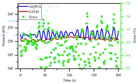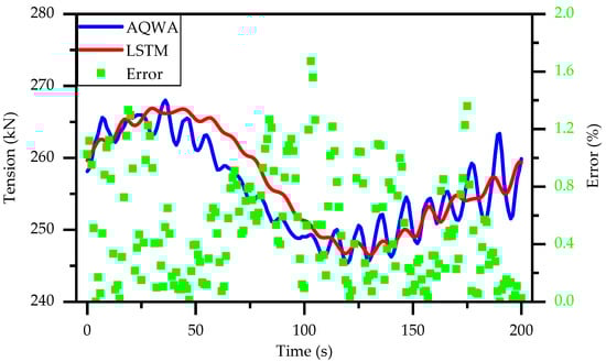 The LSTM model trained in Case 2 predicted the mooring tensions of the mooring system in four working conditions of the test set. Take out the test set, AD10 Mooring Line 8, AD35 Mooring Line 4, AD32 Mooring Line 3, AD7 Mooring Line 7 prediction results, and AQWA results to draw the time history curve, and draw the error distribution map for the first 200 s and statistics on the results of 4 test sets. These are shown in Figure 6, Figure 7, Figure 8, Figure 9, Figure 10, Figure 11, Figure 12 and Figure 13 and Table 13, Table 14, Table 15 and Table 16.