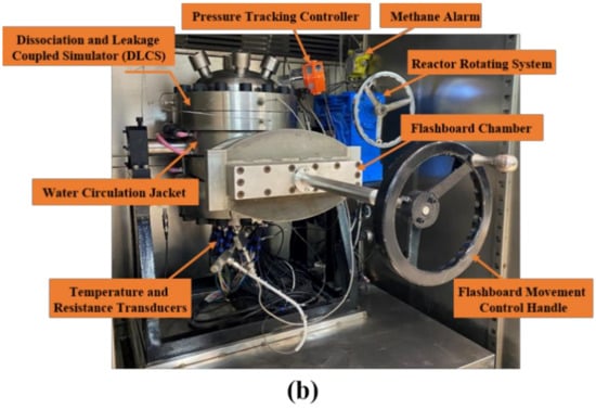 To ensure the stability and safety of the reaction system, some detailed controls and connections were designed. As mentioned above, to solve the differential pressure problem of the flashboard, a pressure tracking system was adopted, as shown in Figure 1b. The pressure tracking controller is linked to the reactor cap and controls the automatic gas exhaust of the OC by monitoring the pressure difference between the OC and SC. The pressure difference between the two parts is generally not more than 0.3 MPa in our design program. A gas acquisition port is connected in parallel with the pressure tracking controller to realize the automatic update of the collected gas phase and reduce the measured error caused by inhomogeneous gas phase distribution. In addition, the problem that the hydrate may block the pressure sensor was considered. Four pressure sensors (0~25 MPa, ±0.1 MPa, Trafag) are installed in the SC and mainly at the outlet of the production wells. Due to many of the perforations on production wells, the probability of their complete blockage by hydrate can be decreased. The feedback between the pressure tracking system and the multiple pressure sensors reduces the occurrence of excessive exhaust or non-exhaust of the OC. In view of the overpressure problems that may be caused by hydrate dissociation, a safety valve is connected in the upper and lower cavities of the reactor, and a methane detector is installed in the air bath. In addition, a set of rotation system is configured to realize the 360° rotation of the reactor in the vertical space, which is convenient for the installation, disassembly and maintenance of the reactor system.