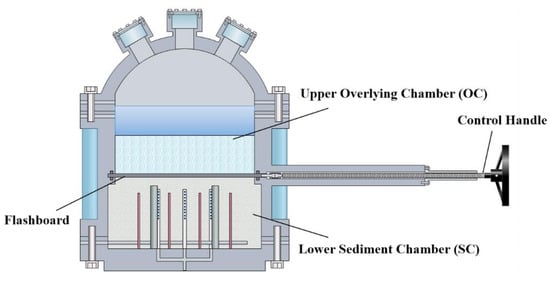 The longitudinal section of the reactor is displayed in Figure 2. Based on the movable flashboard, the whole reactor could be divided into an upper overlying chamber (OC) and a lower sediment chamber (SC). The effective volumes of the OC and SC are 19.9 L and 10.3 L, respectively, in which the volume of the upper cap is 8.5 L. The maximum sediment filling height of the SC is 15 cm, the height of the intermediate reactor body contained in the OC is 20 cm, and the filling height of the overlying strata in the OC in this study was 10 cm. The structure of the flashboard system is the core innovation of this device and also the most difficult part to design. According to previous device reports on hydrate exploitation, there is almost no simulated hydrate-free overlying strata above hydrate-bearing sediments, and the key difficulty is the realization of the dynamic separation and natural contact between hydrate sediments and overlying strata. The flashboard in the device is shown in Figure 3, which is composed of a stainless-steel plate with a thickness of 0.5 cm and a movably connected steel rod. The other side of the rod is located in the atmospheric environment outside the reactor system and is connected with a control handle to realize the insertion and extraction of the flashboard. When the board is pulled out from the reactor, it is located in the flashboard chamber, and the upper and lower parts of the reactor are linked. The middle reactor body located in the OC and SC of are internally connected with a spiral sleeve to realize the seal of the two sides of the inserted flashboard through extrusion. In the first few constructions of the separation system, we tried some more complex structures, but the results were not ideal. Finally, we simplified the structure by adopting some fine design and appropriate sealing and realized the dynamic separation of the DLCS. However, due to the thin thickness of the board, the pressure difference between its two sides cannot be too large, otherwise deformation may occur. Therefore, we designed a pressure tracking system to maintain the constant differential pressure and solved this problem. In the experiment, the pressure of the OC of the reactor was generally slightly higher than that in the SC. More details about the pressure equilibrium are described below.