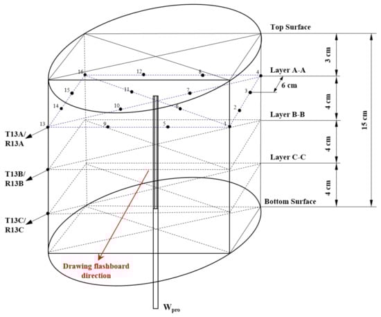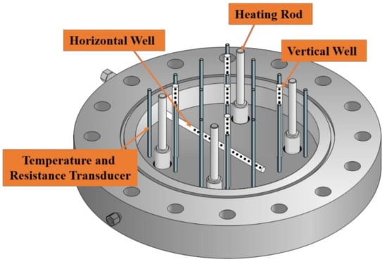 The structure of the bottom plate is shown in Figure 4. The temperature transducers, electric resistance transducers, production wells and heating rods are all embedded into the DLCS from the bottom of the plate. The thermometers are Pt100 with the range of −20~200 °C and measurement accuracy of ±0.1 °C. The electric resistance is measured by Agilent 34970A. The measurement range is 0~1000 KΩ and the accuracy is ±0.1 KΩ; 4 × 4 pairs of temperature and electric resistance transducers are inserted into the bottom, corresponding to the sixteen holes in Figure 4. There is a set of temperature and electric resistance transducers in each of the hole, and the interval between adjacent temperature or electric resistance sensors is 6 cm. For each set of temperature or electric resistance transducers, there are three measuring points in the longitudinal direction, and the interval between adjacent points is 4 cm. Therefore, there are 16 temperature and electric resistance measurement points on each layer, and 48 temperature and electric resistance measurement points distribute in the simulated hydrate sediment space. Through the temperature and electric resistance responses in the hydrate formation/dissociation processes, these measurement points can be used to judge the hydrate position, hydrate state and the spatial dissociation difference in the hydrate exploitation process. Five vertical wells and a horizontal well were arranged in the plate. The production grooves on all the production wells are perforated and wrapped with sand control mesh. Through the selection of the wells, the influence of single well, multi well and well layout on hydrate dissociation can be investigated. In addition, four heating rods with heating power up to 1 kW are installed at the bottom of the plate, which can be used for temperature heating to simulate varied stratum temperature differences or hydrate dissociation by utilizing electric heating method.