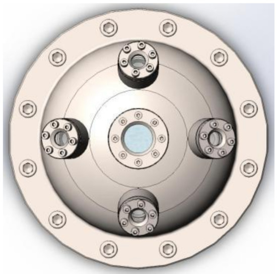 The structure of the reactor cap installed with five windows is shown in Figure 5. The central window is mainly used to observe the state changes of overlying strata and water in the OC, and the process is recorded by a charge coupled device (CCD). The four lateral windows are mainly used to provide light source and can also be used for visual observation. In particular, in order to realize the overall record of the simulated overlying layers, the height of the central window structure needs to be designed shorter to expand the observation field. Therefore, sapphire is used as the transparent window, which has strong pressure resistance and good optical performance. In addition, seawater and gas sampling ports are set at the side of the cap to measure the CH4 concentration change in liquid and gas phase.