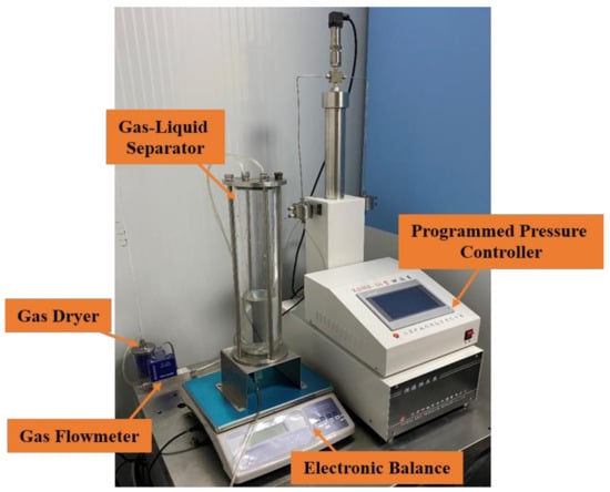 The gas-liquid collection system is used for the quantification of gas and liquid in the experimental process, as shown in Figure 7. It is mainly composed of programmed pressure controller, gas-liquid separator, electronic balance, gas dryer and gas flowmeter. The pressure controller plays the role of back pressure with the maximum working pressure up to 30 MPa. By using the pressure controller, the direct depressurization method for hydrate dissociation can be carried out by setting a constant pressure. It can also realize the pressure gradient drop or constant speed drop in the DLCS for hydrate dissociation through its internal program control, in which the minimum depressurization amplitude is 0.01 MPa/min. The gas and water from the program pressure controller enter the separator, and the water yield is recorded in real time through the electronic balance. The gas leaving the separation tank enters the gas dryer, in which the desiccant is anhydrous silica gel. The dried gas enters the gas flowmeter to measure the instantaneous and cumulative gas flows.
