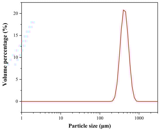 The experiment process mainly includes two parts: hydrate formation and dissociation. The simulated hydrate sediment environment is water saturation condition [37]. The detailed distribution of the measurement points and the configuration of the production wells are shown in Figure 9. In this experiment, only the central well was used for gas production. The DLCS was first cleaned with deionized water, and then the quartz sand with particle size in the range of 330–610 μm was filled in the SC and compacted, in which the detailed particle size distribution is shown in Figure 10. The porosity of the quartz sand sediment was approximately 42.0%. Then, the flashboard was inserted to separate the OC and SC of the reactor. After that, the OC was filled with mixed sediments (including silt, coarse sand, bentonite, kaolin and calcite) and compacted until it was difficult for water to penetrate downward. The mixed sediments were used to simulate the low-permeability overlying strata of hydrate-bearing sediment. Both the OC and SC were then vacuum, and the OC was injected with a certain amount of deionized water to simulate the overlying seawater. After that, CH4 gas with certain pressure was injected into the SC. In the meantime, the OC needs to be pressurized with N2 gas to maintain the pressure balance. Next, deionized water was injected into the SC, while nitrogen into the OC until the pressure in the SC reached 20 MPa. Then, the ambient temperature was adjusted to 8 °C for hydrate formation. N2 in the OC did not form hydrate in this temperature and pressure condition, but only played the role of inert gas to maintain the pressure balance of the system. Every time the pressure of the SC dropped to 15 MPa, deionized water was injected again for the continued hydrate formation. After several times of water injection, the pressure in the SC decreased to 13.2 MPa, and the hydrate formation process finished. The hydrate, gas and water saturation can be calculated according to previous studies [17,38,39].
