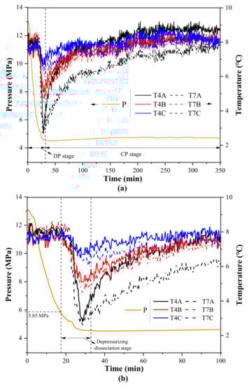 Figure 11 presents the system pressure change and the temperature evolutions from the boundary to the center and different horizons of the hydrate-bearing sediment during the depressurization and hydrate dissociation processes. The whole process can be divided into DP stage and CP stage. The dissociation pressure of CH4 hydrate at 8 °C is approximately 5.85 MPa [40], and therefore, a hydrate dissociation stage was included in the DP stage. Due to the Joule–Thomson effect, the temperature may decrease during gas exhaust. However, the temperatures remained almost unchanged before depressurized to the hydrate dissociation pressure in this experiment, even increased slightly. Since there was no other high-temperature heat source in the system, it may be caused by the exothermic reformation of local hydrate caused by fluid disturbance [41]. All the temperatures dropped rapidly after hydrate dissociation, among which the reduced degrees of T4A and T7A were the most obvious. The declined system temperatures were mainly due to the latent heat of phase transition absorbed by dissociated hydrate. The heat mainly derived from the sensible heat of hydrate sediments, overlying strata and overlying seawater. For unevenly distributed hydrate, the temperature will show obvious differences in sediment space due to various amounts of heat adsorption. According to the degree, it can be judged that the hydrate is mainly distributed in the upper hydrate sediments. In the stage of rapid temperature decline, the points T4 in each layer was slightly higher than T7, which showed the movement of the hydrate dissociation front to some extent