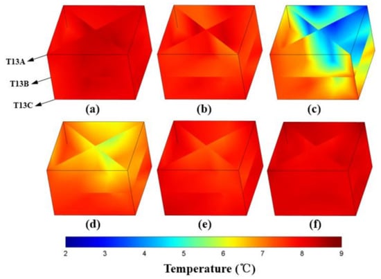 The spatial distribution of temperatures in the hydrate-bearing sediment from the starting point to the end point of hydrate dissociation is presented in Figure 12. At 20 min, CH4 hydrate initially dissociated, and the temperature in the whole SC decreased slightly. It can be found that the temperatures around the production well were relatively higher. This is because of the greater turbulence degree, which enhanced gas-liquid contact and hydrate reformation. The overall temperature in the SC dropped to the lowest at about 28 min, and the spatial temperature distribution was almost divided into two areas, of which the low-temperature area was mainly distributed in the said of points T4 and T7 in the upper sediment. One reason is that in the hydrate formation process, hydrate wall climbing phenomenon occurred at the top of points T4 side and induced the migration of a large amount of water, which resulted in seriously inhomogeneous hydrate distribution [45]. In fact, there might also be quantities of CH4 hydrates on the top of the sediment at T13 side. However, during the depressurization and hydrate dissociation stage, the overlying seawater flowed to the production well mainly through this area, and therefore, the gas diffusion restriction caused by high saturation of pore water inhibited the dissociation of CH4 hydrate. In addition, the continuous convective heat transfer supply further slowed down the temperature drop. Following the lowest temperature, all the temperatures in the hydrate sediment gradually rose due to the decreased hydrate dissociation rate and external heat transfer. At 75 min, the overall temperatures of the reservoir were higher than 6 °C, and the low temperature zone extended from the sediment center to the boundary. It should be noted that the temperatures at T13 side were lower than that at 28 min instead, which confirmed that residual CH4 hydrate in this area continued to dissociate during this period. However, due to the low driving force, its dissociation was relatively mild. The heat transferred from the environment could nearly meet the demand for hydrate dissociation, so the temperature decreased slightly. To sum up, the overlying seawater infiltration can significantly influence hydrate dissociation and flow field changes in the reservoir. On the one hand, the downward penetration of seawater brings additional heat supply for hydrate dissociation, but it will also significantly inhibit hydrate dissociation due to diffusion restriction and consequently affect the gas production rate. At 185 min, with the almost complete dissociation of CH4 hydrate, there was only a relatively low temperature zone, the sediment center. At 345 min, the whole reservoir temperature returned to the initial temperature before depressurization. The movement of temperature front was similar to the phenomenon found by Fitzgerald et al. [41] In this early work, they developed a set of classic large-scale hydrate formation/dissociation device with 70 L volume. The hydrate dissociation by central heat stimulation method was studied by using the device. The result showed that the high temperature front moved from the sediment center to the edge during hydrate dissociation process.