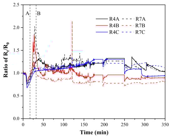 The evolution of Rt/R0 ratios for R4 and R7 in the three layers during the whole gas production process is shown in Figure 13. The R0 represents the initial resistance value before depressurization, and Rt represents the resistance value at time t. The dotted lines A and B in the graph represent the time for initial hydrate dissociation and the end of depressurization process, respectively. The electric resistance decreased as a whole in the initial depressurization period. This is because fluid migration changed the gas/water/hydrate contents between the pair of electrodes of a single electric resistance. We speculate that free water replaced suspended hydrates. During the period between time A and B, the resistance values of R7A and R4B rose significantly, and the R4A and R7B also increased slightly. This indicated a large amount of free gas generated from dissociated CH4 hydrate, which displaced part of the free water between the electrodes and resulted in the sharp increase in electric resistance. In the early stage of CP stage, each resistance value showed nearly continuous change trend. The sudden increase and decrease of resistance values during this period can be mainly attributed to the filling of gas and water between the pair of electrodes, respectively. Therefore, the movement of flow field at each position can be deduced through the change of resistance value. It should be mentioned that due to the high recording frequency (10 s for once) of resistance data in this experimental test, some resistance values were not collected after 150 min. Consequently, the stepped trend phenomenon occurred in Figure 13. In future experiments, the resistance acquisition time will be adjusted. After the complete hydrate dissociation, each resistance value no longer obviously changed.