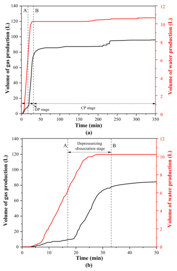 Figure 15 presents the changes in gas and water production volumes during the whole depressurization and hydrate dissociation process. It can be observed that before the pressure dropped to the hydrate dissociation pressure, the product was mainly water with only a small amount of gas being discharged. This is because the system was water saturated and the gas content was only 11%. The gas produced in this stage was mainly free gas with a very small amount of dissolved gas. After the pressure dropped below 5.85 MPa, the hydrate began to dissociate and led to the decrease of reservoir temperature at 20 min, as shown in Figure 11. However, the gas production rate did not obviously increase, and the gas produced by hydrate dissociation was temporarily bound inside the sediment in the period. At about 20 min, the gas production rate was significantly accelerated, and the water production rate gradually slowed down. During the period of 20–33 min, the produced gas was mainly derived from CH4 hydrate dissociation. The large amount of gas produced in this stage corresponded to the rapid decline of temperature in Figure 11. There was almost no water production between 50 min and 175 min in the CP stage. During this period, gas from dissociated CH4 hydrate was slowly produced. The changed gas production rate was similar to the research in a closed system conducted by Fitzgerald et al. [41] In their experiment, the initial CH4 production yield caused by hydrate dissociation first accelerated and then gradually slowed down. However, the decrease in gas production rate was mainly due to the reduced hydrate saturation in their experiment. In our experiment, in addition to the small quantity of residual hydrate, temperature was also an important factor limiting hydrate dissociation. The sudden step rise of gas production occurred at 225 min may be due to the temporary blockage of the production well. After 350 min, the hydrate was completely dissociated, and the final gas and water production were 96 L and 10.7 L, respectively. Since the total amount of water injected into the SC was only 4 L, the extra water came from the overlying seawater. This demonstrates the inference of overlying seawater infiltration analyzed above.