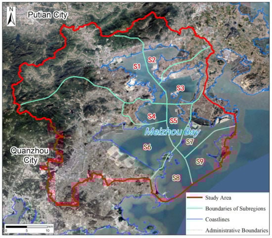 Here, the Meizhou Bay and the catchment units in the adjacent land were considered as the study area. Zonal boundaries were delineated according to marine ecological characteristics, and the complete homogeneous subregions were evaluated independently from administrative boundaries to propose an improved zoning scheme for marine ecosystems. Although some previous MSPs have been conducted based on marine ecosystem boundaries [55], the commonly assessed parameters of marine natural boundaries, such as breeding, bait, migration areas, water temperature, salinity, estuaries, wetlands, and other typical ecosystems and habitats can be observed well only in large-scale sea areas, because these factors stay relatively stable over small-scale sea areas. Hence, when selecting a small-scale research area, such as the Meizhou Bay chosen here, the boundaries of the considered marine ecological characteristics should include the distribution of distinct physical characteristics, such as channel trends, tidal currents, ecosystem or protected area boundaries, and catchment lines. These elements have notable variability over small-scale sea areas such as Meizhou Bay. Consequently, they can better support the zoning of the subregions’ boundaries of the small-scale research areas.