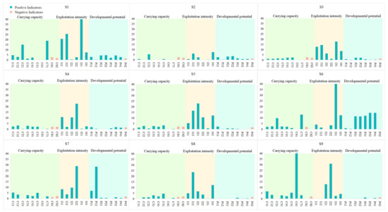 - For S1, I31(marine economic development index), I12 (reclamation intensity), and I11 (utilization rate of sea areas) were assigned the highest scores under the dimension of exploitation intensity. These were followed by C71 (proportion of forested area to total land area) and C21 (aquatic product production) under the dimension of carrying capacity. All other indicators were assigned relatively low scores. This is attributed to S1 being rich in natural resources, and land-based economic development promoting the thriving coastal areas. In general, S1 scored higher in the two dimensions of exploitation intensity and carrying capacity.