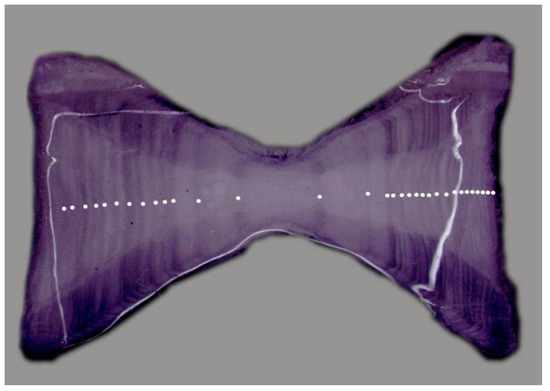 Longitudinal cross-section of a vertebral centrum from a 982 mm disc-width female Rhinoptera marginata estimated to be 18 years old. White dots denote opaque bands.