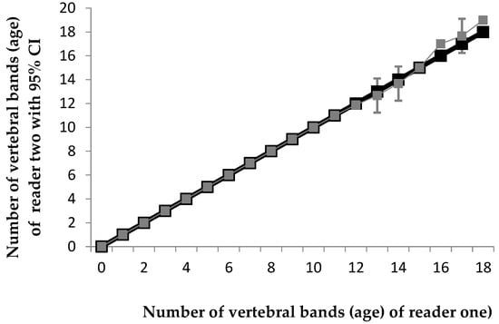 In total, 224 (170 females and 54 males) Lusitanian cownose rays were collected and their ages assessed. Females ranged in size from 210 to 998 mm DW and 238 to 13,600 g W, while males ranged from 130 to 866 mm DW and 140 to 8250 g W (Table 1). Vertebral samples from all specimens (100%) were readable and the age assessments from both readers were within two years, resulting in an IAPE of 2.85%. Moreover, the comparisons of these counts indicated that no appreciable bias existed between readers (Figure 3). Captured males ranged in age from 0 to 9 years, while females ranged in age from 1 to 19 years.