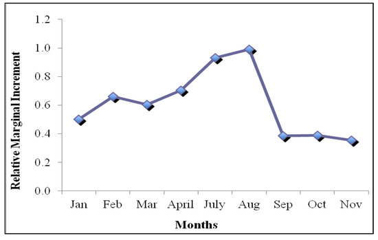 Mean monthly marginal increments of opaque bands for Rhinoptera marginata from the northeastern Mediterranean.