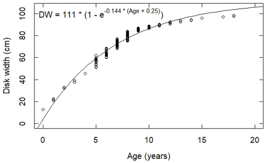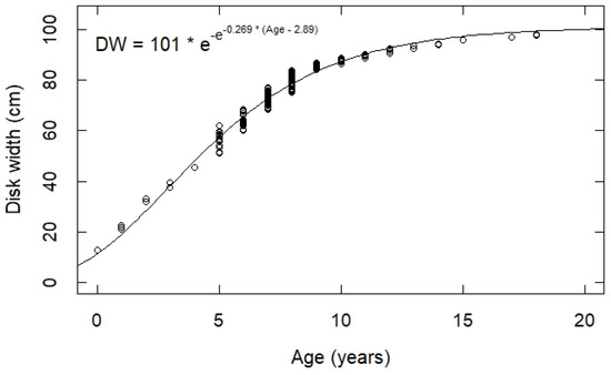 The largest Lusitanian cownose ray we encountered during the study was a 998 mm DW female, close to the DW∞ of 101.01 cm predicted by the Gompertz growth model. According to Neer and Cailliet [36], the Gompertz growth model provides the best fit for the size-at-age data for Torpedo californica. Mollet et al. [37] found that the Gompertz growth model best described the growth of Dasyatis violacea, indicating that it provided more realistic estimates of the growth rate than the VBGF.