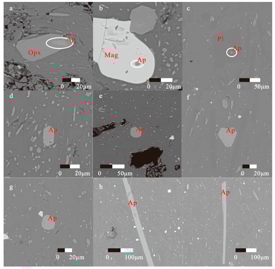 The sample hand specimens are black in color and porphyritic, with phenocryst contents <5 vol.%, mainly composed of plagioclase, pyroxene, and minor magnetite. The sample thin sections were observed using a polarized light microscope. The sizes of phenocrysts are 50−600 μm, and they exhibit euhedral to subhedral texture; the matrix is composed of acicular plagioclase micro-crystals, granular pyroxene micro-crystals, and minor granular magnetite micro-crystals with pilotaxitic texture (Figure 2f–h). According to the back-scattering images of the thin sections, apatites exist primarily as micro-crystals in the host dacite, and partly as inclusions in plagioclase, pyroxene, and magnetite phenocrysts, implying the presence of early apatite-saturation in melts (Figure 3a–c) [42]. The apatite micro-crystals in the matrix have a size of ~20 μm, mostly exhibiting equant to sub-equant crystals in euhedral-subhedral texture, and showing uniformly bright surfaces without mineral- or fluid-inclusions (Figure 3d–g), indicating that no hydrothermal replacement has occurred. A very few apatites are highly acicular and large (maximum elongation along the c-axis to more than 300 μm, as in Figure 3h,i), which may precipitate during a rapid quench [24].
